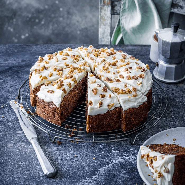 Carrot cake is such a deliciously moist and moreish cake and ours is no exception. Our Round Carrot Cake comes packed with sultanas and walnuts, with a delicious Belgian white chocolate buttercream decorated with nibbed walnuts.
