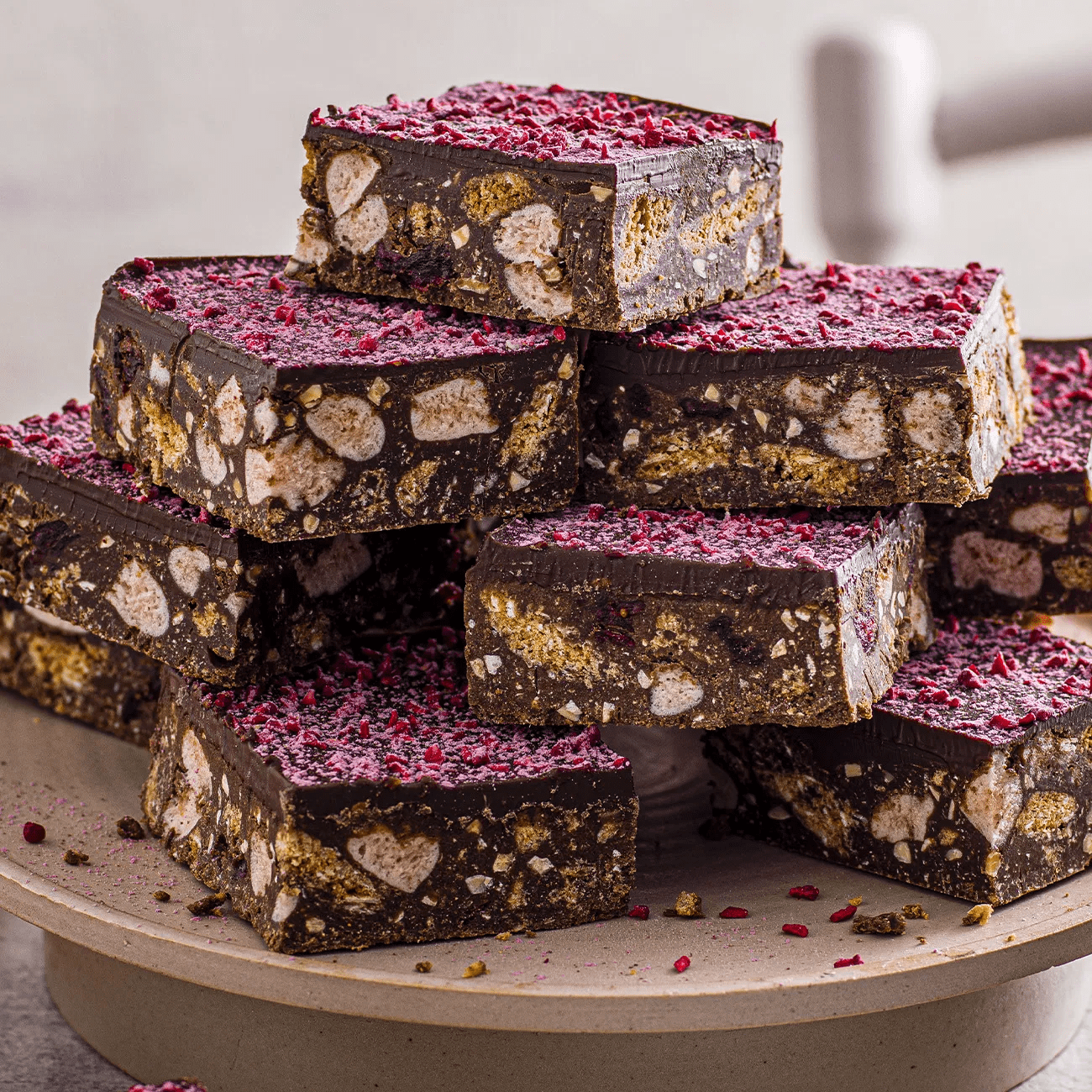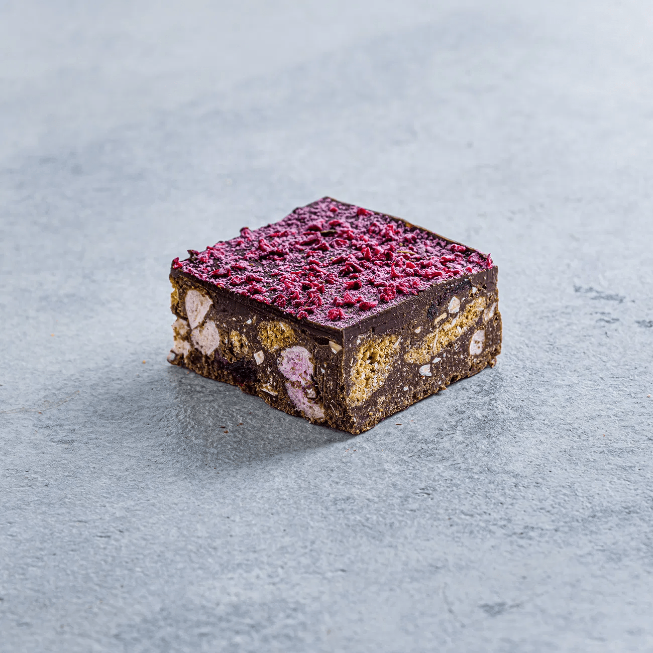 Our gluten-free rocky road is made with biscuit pieces, vegan marshmallows and cranberries which is then infused with natural raspberry flavouring and topped with smooth Belgian dark chocolate, pink dusting powder and freeze dried raspberry pieces.