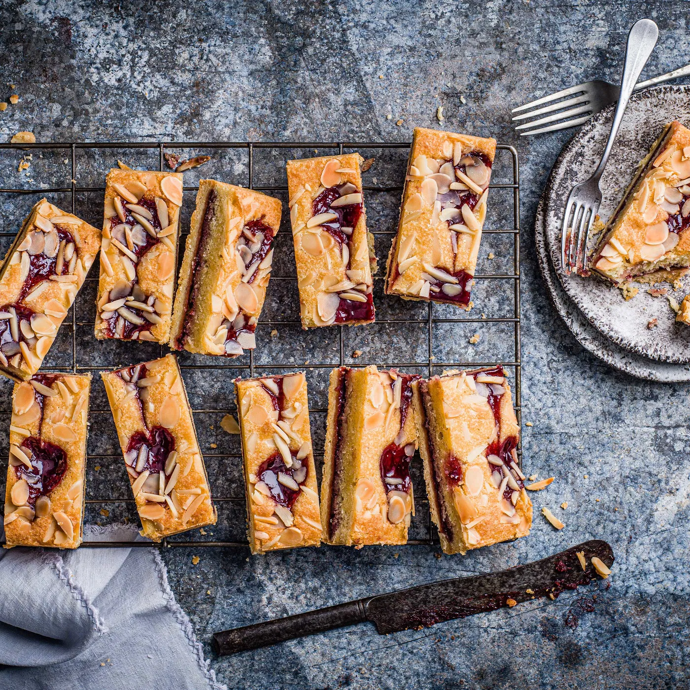 A quality take on a classic, with shortbread, a layer of sweet raspberry jam and a layer of frangipane finished with blobs of raspberry jam, slivered almonds and flaked almonds.